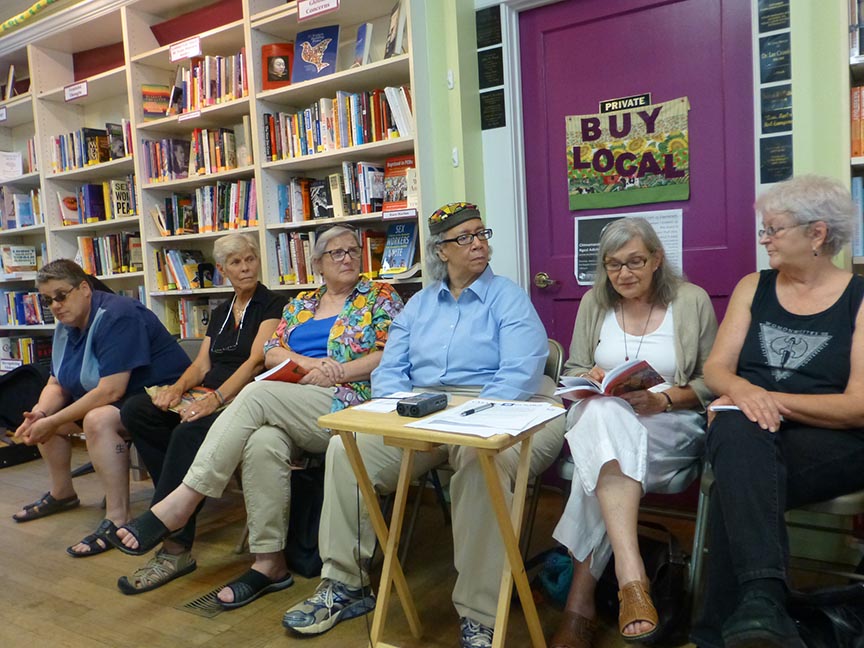 Charis Books and More hosted a book launch for the first *Sinister Wisdom* special issue the Herstory Project Published (volume 93, summer 2014). Left to right: Lenny Lasater, Barbara Ester, Rose Norman, Pat Hussain, Charlene Ball (reading from the book), and Gail Reeder.