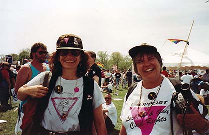 Corky Culver (right) at the 1993 March on Washington for Lesbian, Gay, and Bi Equal Rights and Liberation. (Unidentified woman standing to her left.)