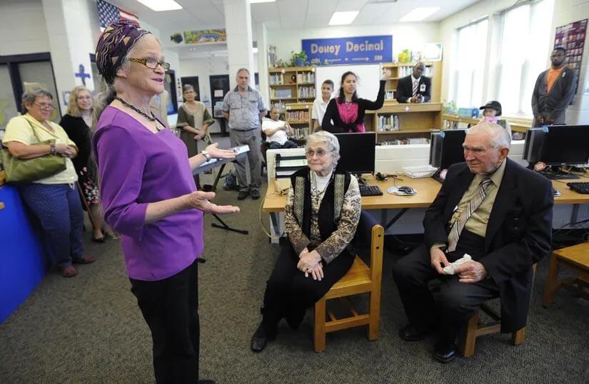 Meta Ellis, left, with her parents, seated, Jeannie and Robert Graetz., This event was in honor of her mother, Jeannie Graetz, in 2013, at a Montgomery, Alabama, elementary school.