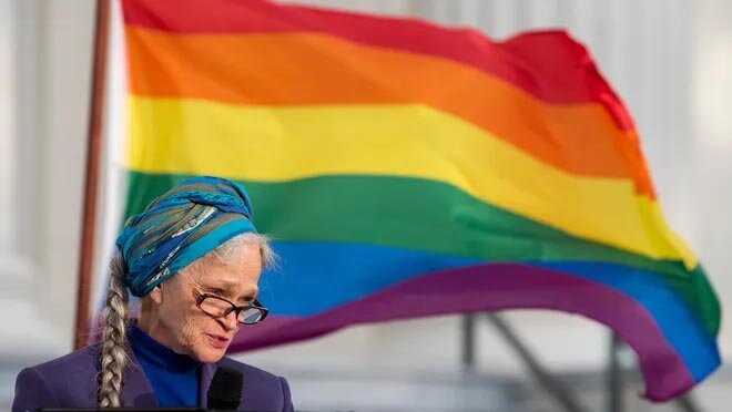 Meta Ellis with rainbow flag Mickey Welsh Advertiser