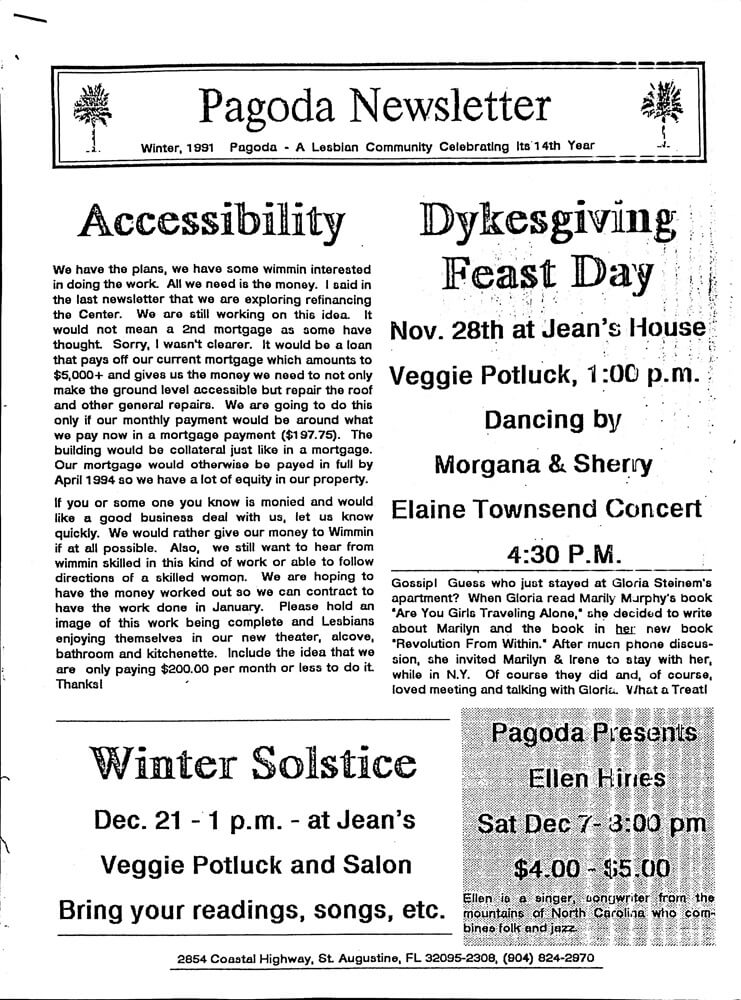The Pagoda newsletter for winter 1991 describes a project to make the theatre and ground floor sleeping space more accessible. The church borrowed $25,000 from private donors to complete that project; to pay off the mortgage; and to make important repairs to the building and swimming pool.